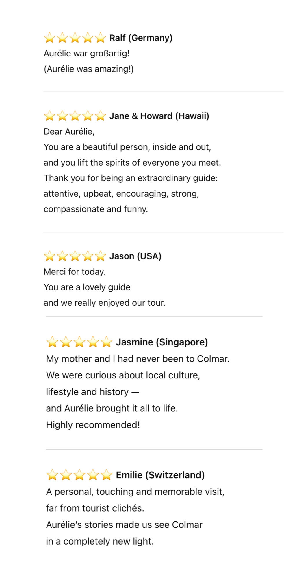 Born and raised in Colmar, I’ll take you through my hometown with stories, and the kind of small details only a true local would know.My tours blend humor, history, and personal memories: from the places I played as a child to my grandparents’ stories from the war.